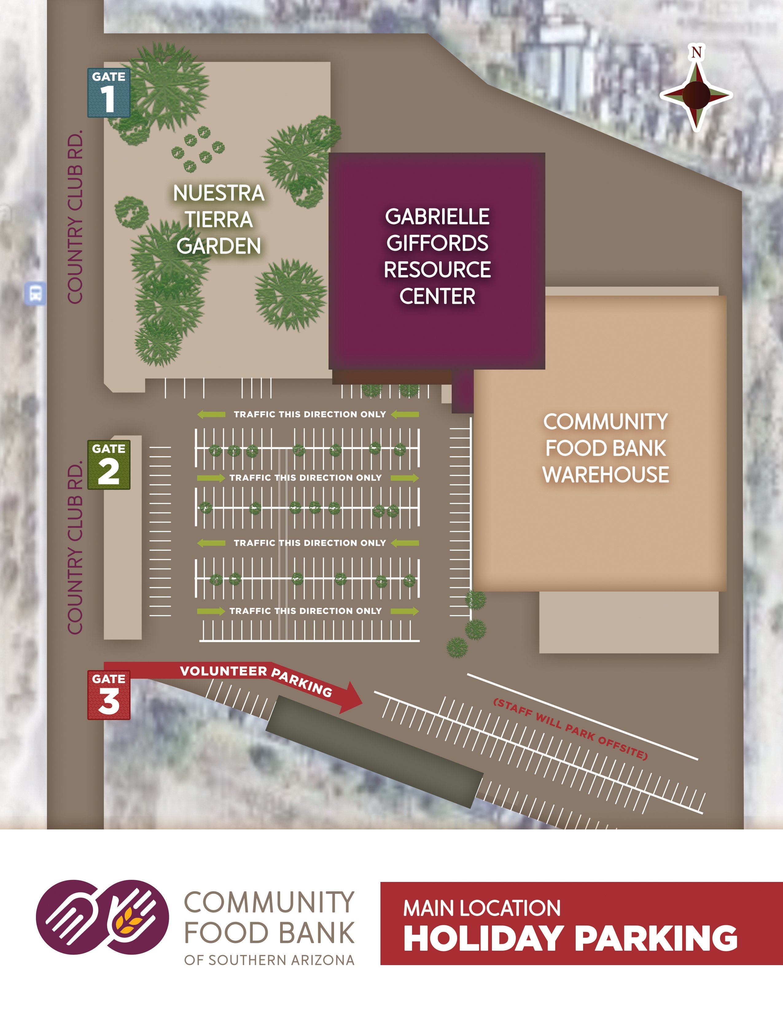 • Both gates will be open upon arrival for volunteers and staff to park. Please park in the southern region of the main lot if possible. If it looks full, please park in the south lot, and be vigilant for truck traffic. (see below)
